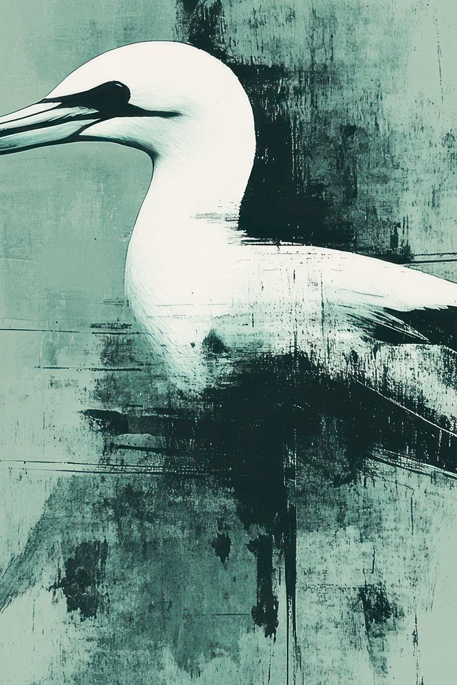 This striking artwork shows an elegant bird portrait against a mint green background, executed in an abstract, raw style. The contrasting white and dark tones in the bird emphasise the clean lines and give the image a modern, graphic look. The sophisticated textures in the background add depth without detracting from the minimalist composition. This artwork exudes calm and sophistication and is perfect for modern, industrial or minimalist interiors looking for a unique artistic element.