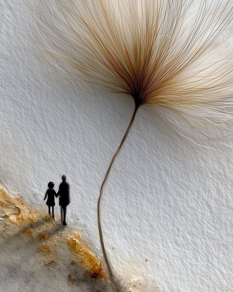 A child and elder holding hands are formed by the dandelion shadow, symbolizing the enduring bond between generations. This piece embraces a Scandinavian aesthetic with sparse detailing, clean lines, and soft neutral tones.