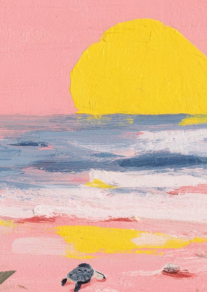 A gouache painting shows baby turtles running along the beach in front of a pink sky with a yellow setting sun. The minimalist composition uses simple shapes, reduced details and soft pastel colours. The scene conveys a friendly, cute and aesthetic mood, inspired by the style of Matisse. The clear lines, flat colour surfaces and harmonious colour palette create calm and visual balance, while the movement of the turtles and the warm lighting bring the scene to life. The picture has a graphically reduced, inspiring effect and conveys a poetic, playful atmosphere through minimalism and pastel colours.