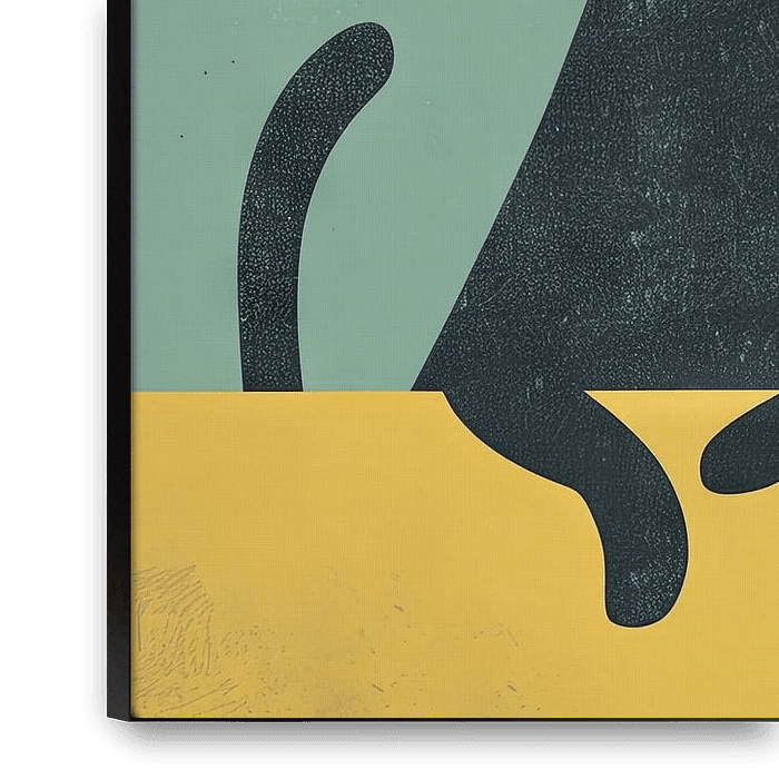 This charming illustration shows a minimalist black cat looking curiously at a cup of coffee. With clean lines and a subtle colour scheme of turquoise and yellow, this image perfectly captures the relaxed atmosphere of a coffee break. Ideal for lovers of minimalist art and cats, this artwork will bring calm and style to your kitchen or…