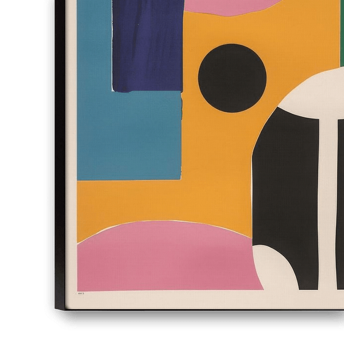A modern abstract work of art that impresses with its clear geometric shapes and bold colours. Vertical areas of colour in green, white and black meet horizontal stripes in orange, pink and yellow, while a central black circle catches the eye. Dark blue/purple shapes and small orange accents create additional dynamism. The minimalist composition on a light background emphasises structure, balance and the harmonious interplay of colour and form - an expression of modern geometric aesthetics without figurative representation.
