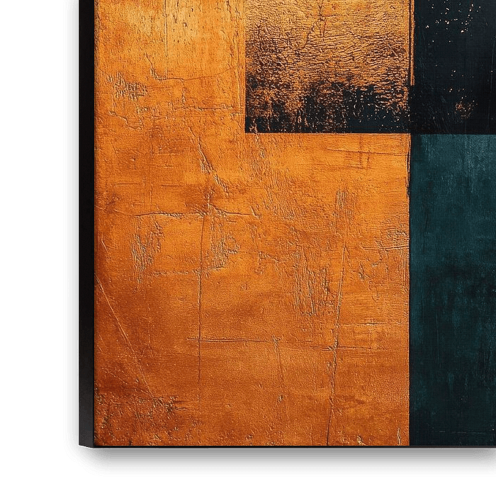 This modern, abstract work of art features a minimalist composition of three squares in turquoise, orange and black. The textured wall background mimics the texture of canvas fabric and adds depth to the design. Digital painting techniques create a simple and elegant style that is enhanced by the geometric abstraction and minimalist approach.