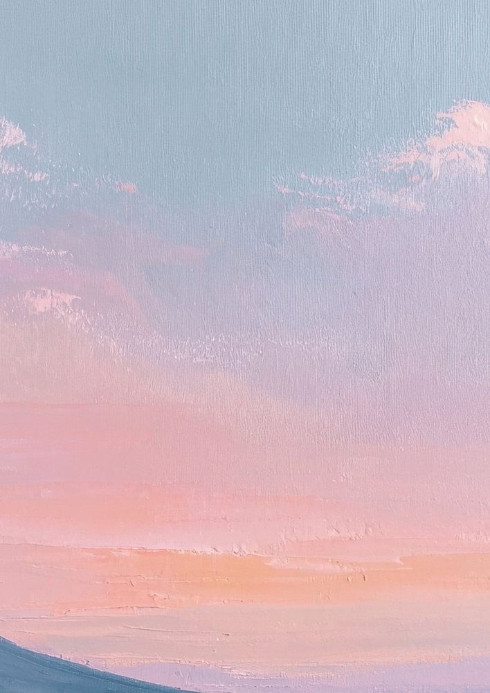 This minimalist oil painting uses the impasto technique and soft pastel colours to depict the vastness of an open landscape. In the foreground, a small river flows towards the ocean, while distant hills frame the scene. The sky glows in a soft pink sunset, conveying peace and harmony. The reduced composition with minimal details draws the focus to the gentle colour transitions, the texture of the brushstrokes and the peaceful mood. The work celebrates the beauty and serenity of nature and invites the viewer to savour the simplicity and vastness of the landscape.