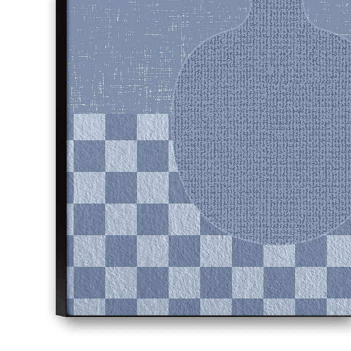 Mixed media art with a botanical leaves drawing, soft textile textures and geometric check pattern.