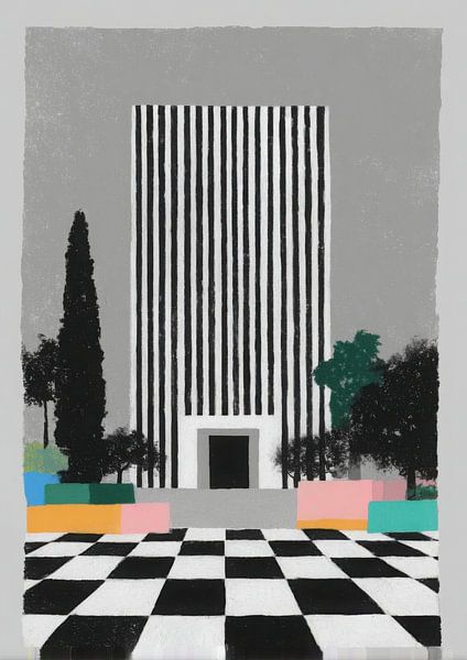 This stylised illustration shows a tall, rectangular building with a white façade and vertical black lines that form a grid pattern. At the bottom is a dark entrance, in front of which is a platform with horizontally stacked coloured blocks in pink, teal and yellow. The foreground is characterised by a black and white chequered floor,…