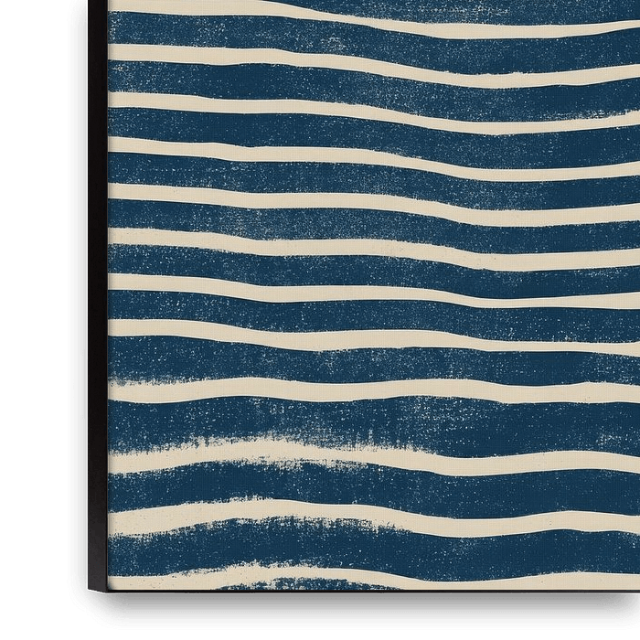 This minimalist design shows a calm seascape with a central, large orange-red ball of sun above the horizon. The sky is light beige with a slight colour gradient, while the sea below is represented by horizontal, wavy lines in dark blue and white, creating texture and depth. The waves are evenly spaced, vary in thickness and create a…