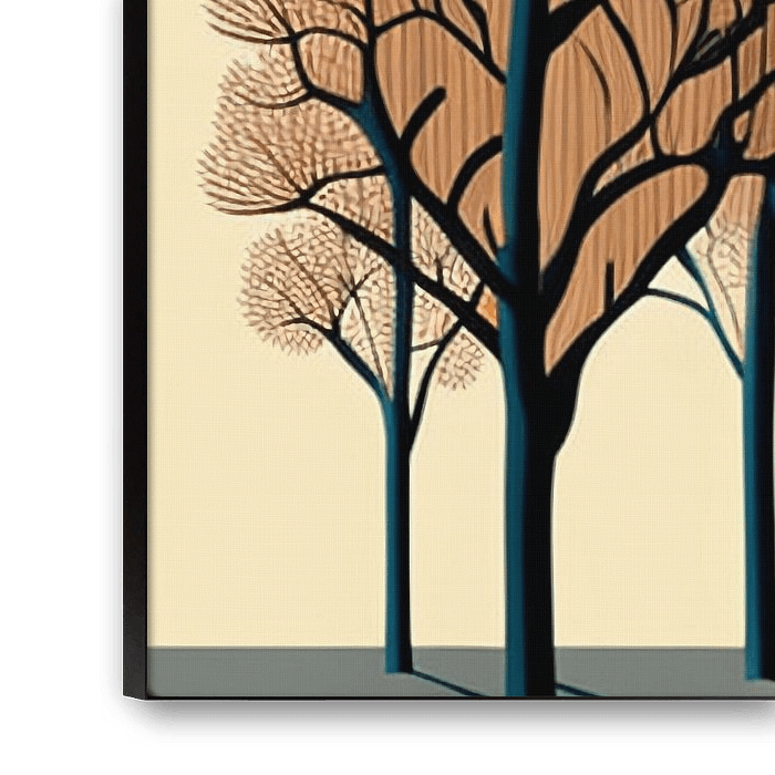 A clean, simple illustration of four large trees whose branches gently branch into each other. Each tree is coloured in warm yellows and rich browns, with unique shapes and textures. The golden yellow leaves stand out against a soft beige or light grey background, creating a peaceful and balanced composition. Ideal for lovers of minimalist art, nature-inspired prints or elegant wall decoration.