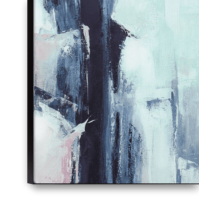 This is a set of three abstract acrylic paintings characterized by a soft, airy palette dominated by mint green, navy blue, and hints of pale pink. The composition blends smooth gradients with bold, textured brushstrokes, creating a dynamic contrast between light and dark elements. The navy sections add depth and structure, while the…