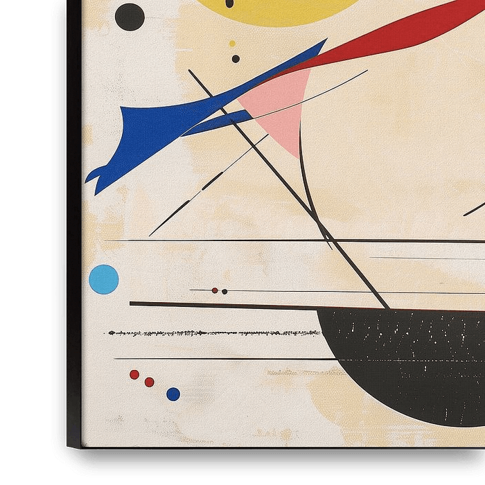 Miró Meets Kandinsky is an ode to these two founding fathers of abstract art. In this series, Miró's playful, organic imagery and symbolic forms fuse with Kandinsky's sense of rhythm, structure and composition to create a contemporary interpretation. This artwork consists of loose, flowing shapes and bright geometric elements moving on…