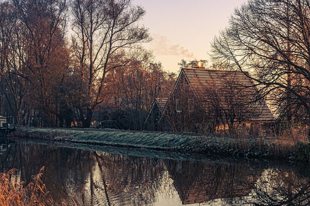 First winter morning with fog and frost in the polder , the Berkmeer . Here the reflection in the ring canal along the oostdijk in heerhugowaard