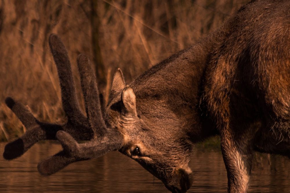 There is a nice herd in the park/reserve in Lelystad on a piece where they have a lot of space. On this morning the sun had just risen for a good hour when I saw the herd taking their morning bath in the water. Very special animals, the females (without antlers) look like a cross between an elk and a Przewalski horse :)