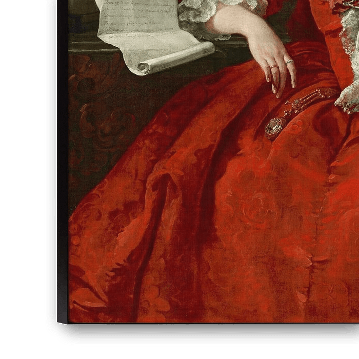 Mary Edwards (1705–43), one of the richest women of her time, repudiated her marriage to an extravagant husband, although this was tantamount to declaring her son illegitimate. She was Hogarth’s friend and arguably his most significant patron during the decade 1733–43. The monumental portrait of Miss Edwards, wearing magnificent jewels and a striking red dress, is a masterpiece in the series of Hogarth’s commanding middle-class portraits, which includes the famous Captain Coram. The open scroll prominently displayed beside the subject champions the virtues of liberty and property that she would have appreciated as manager of a great fortune.