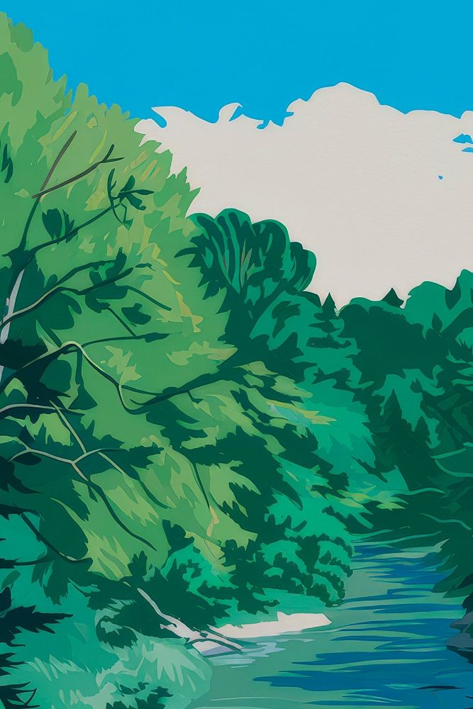 A harmonious interplay of soft blues and greens unfolds in this idyllic depiction of nature, capturing the tranquil flow of the Ozark National Scenic Riverways. The peaceful scenery with lush greenery and radiant sky invites relaxation and brings fresh, calming energy to any living room.