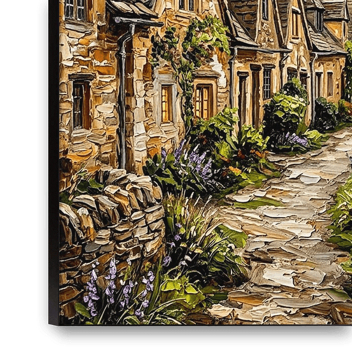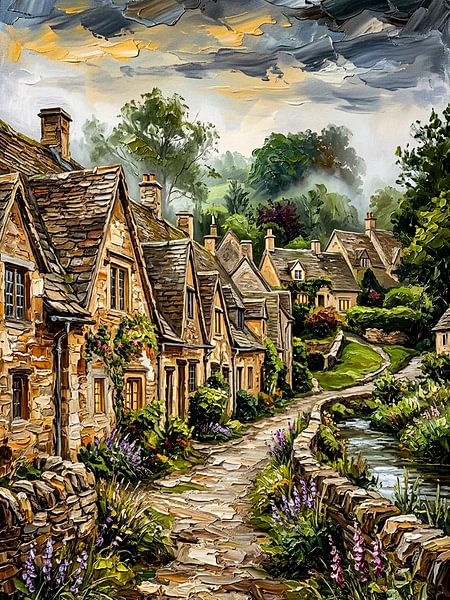 Inspired by the quiet beauty of Bibury, this impasto painting captures a hidden village wrapped in soft morning mist. Thick, textured strokes shape the ancient cottages and lush surroundings, while warm light gently glows through the haze—evoking calm, nostalgia, and a sense of timeless escape.
