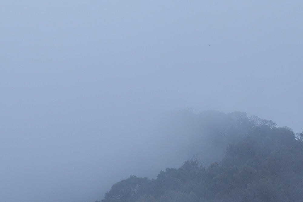 In de mooie bergen van Thailand trekt de mist langzaam over de bergen tijden de dag, met de zon achter de wolken