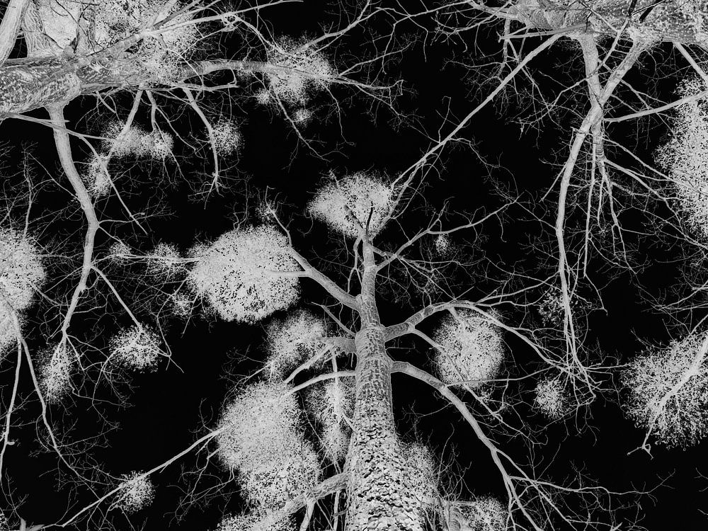 Negative of trees abundantly overgrown with mistletoe. The photo was taken with the camera lying on the ground between the 3 trees to enhance perspective. Inverting black and white creates a "spooky" effect.