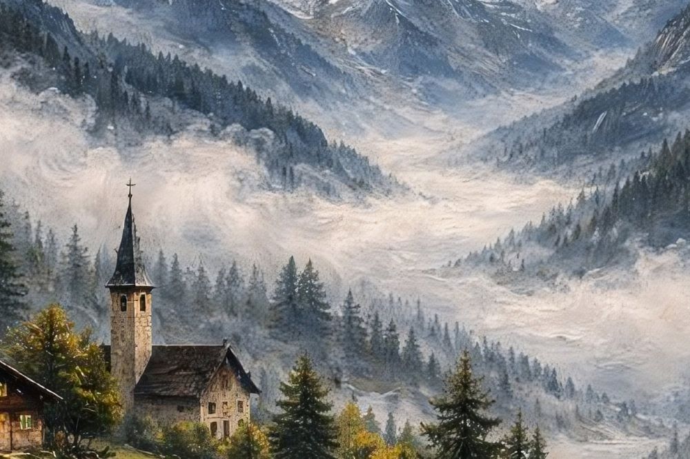 This tranquil alpine landscape portrays a peaceful mountain village nestled among pine forests and rolling hills, with a small church standing quietly at the heart of the scene. Soft mist flows through the valley, partially veiling the dramatic mountain peaks in the background and creating a sense of depth, calm, and timeless beauty.…