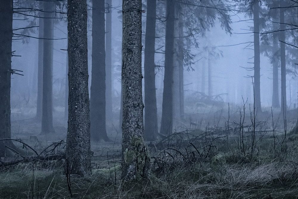 Tall trees stand in a dense forest enveloped by mist. The blue-tinted atmosphere creates a mysterious and serene ambiance.