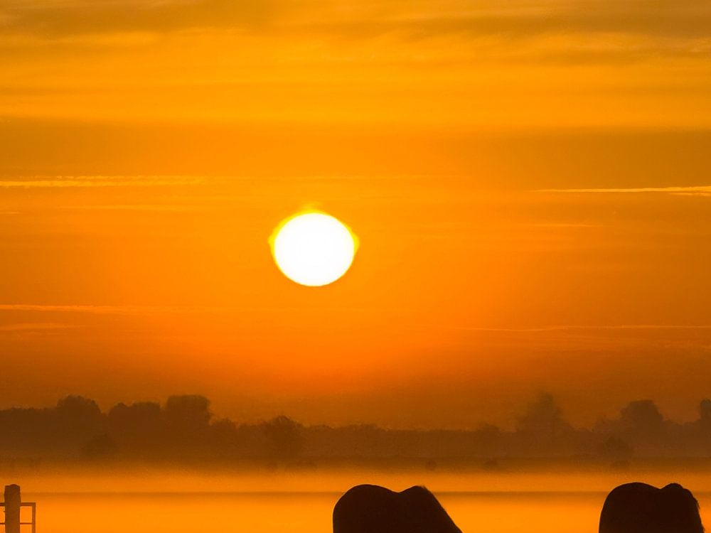 A warm, rising morning sun illuminates a group of horses grazing peacefully in the ground fog. The widest horizon gives peace and space to this atmospheric image. The Friesian landscape in optima forma. A 'must have' for nature and horse lovers.