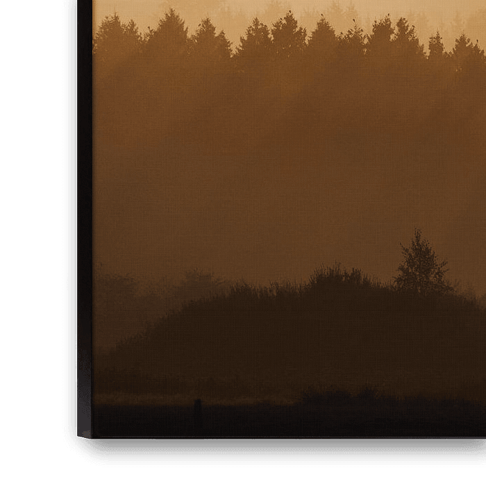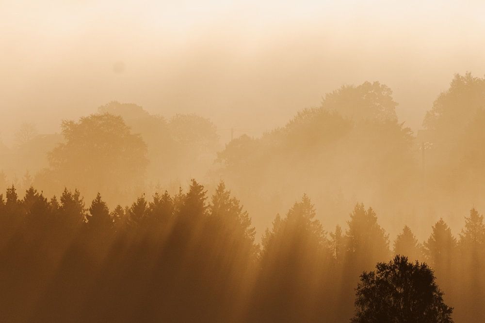 A mysterious image due to the low, warm autumn sun. The low-hanging mist creates a beautiful silhouette of the forest edge on this hill.