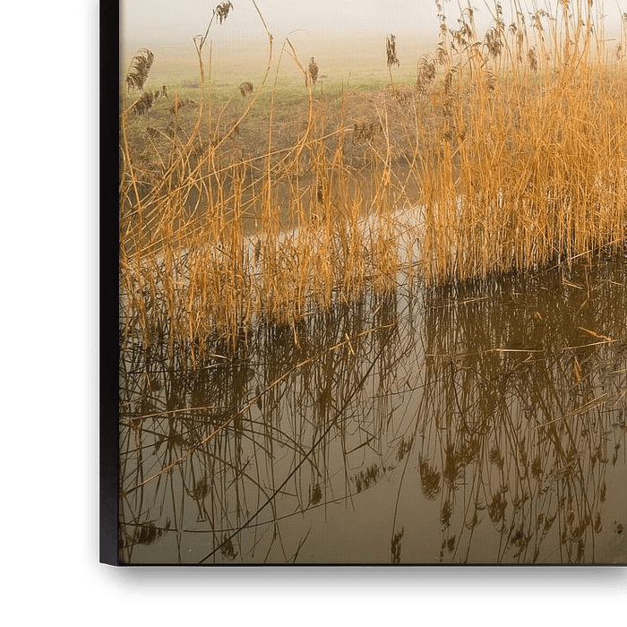 A river running through the meadow on a foggy winter morning