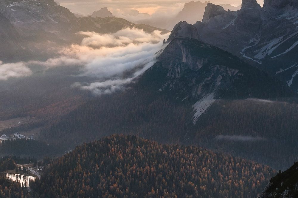View of Misurina, an almost Bob Ross-like autumnal landscape of the Dolomites with the hamlet of Misurina.