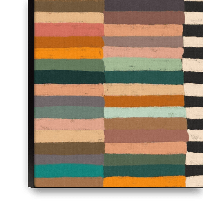 This painting is a vibrant abstract composition with a series of horizontal stripes in different widths and colours. The left side of the painting features stripes in earthy tones of brown, orange, green and muted shades of pink, giving a warm, organic feel. The right side offers a striking contrast with a pattern of alternating black…
