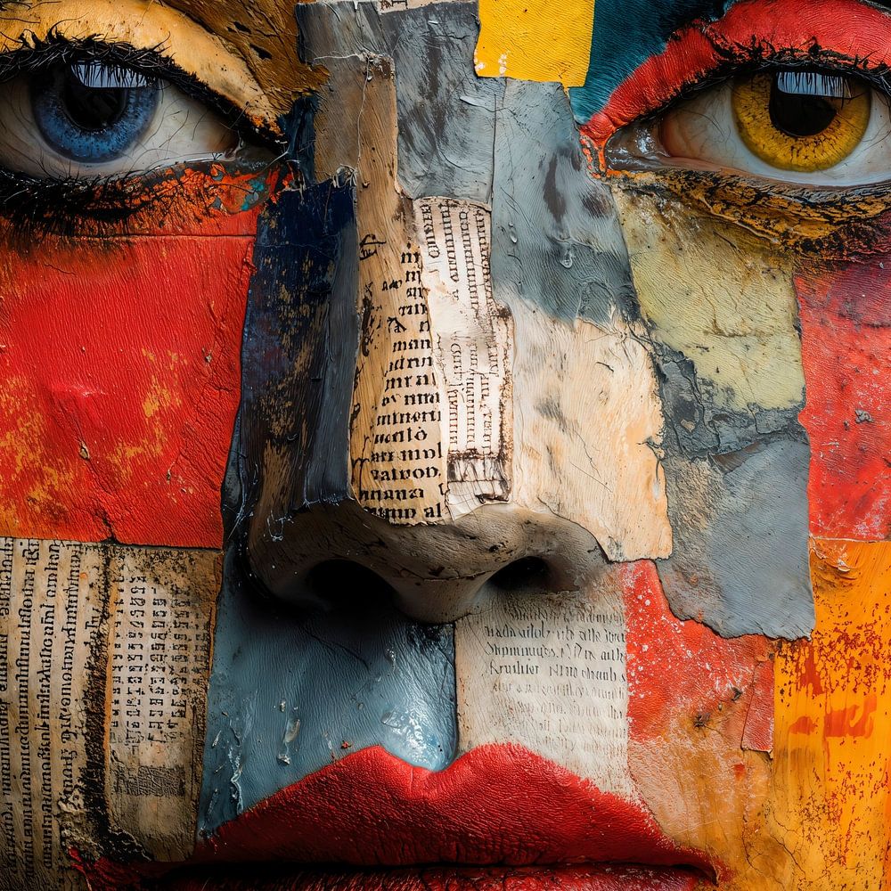 A work of art depicting a woman's face in a mixed-media collage style. The face is rendered realistically and is fragmented and covered with different textures and colours, creating a surreal and abstract effect. The eyes are strikingly depicted, looking directly at the viewer with an intense, slightly melancholic gaze. The style evokes…