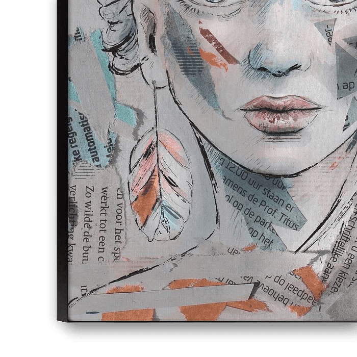This work features shades of orange, turquoise grey and blue. You see here the portrait of a young woman looking straight at you. She has a tough and confident look in her eyes.