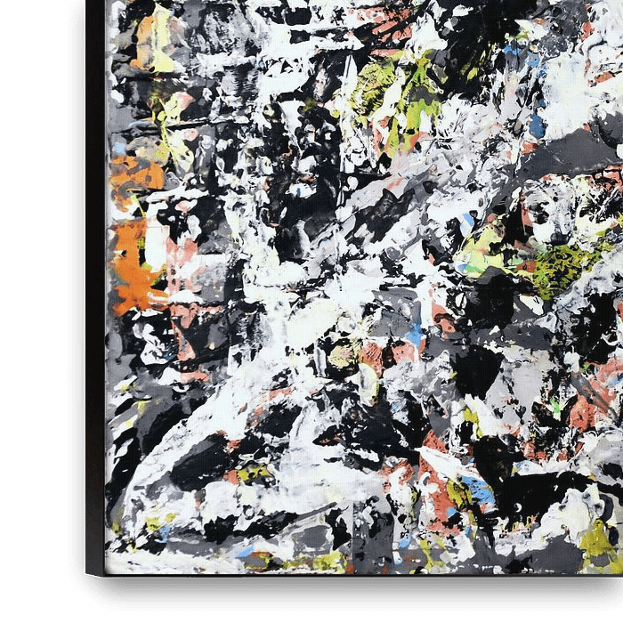 A weave of involuntarily and randomly applied lines of different colours runs through the originally white canvas. Mainly in black and white, the colour framework is supplemented by a little yellow, orange, purple and ochre. The resulting chaos stimulates the mind and imagination when viewed. (elha)