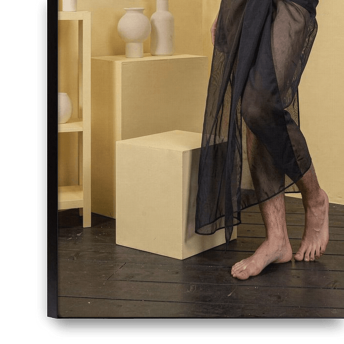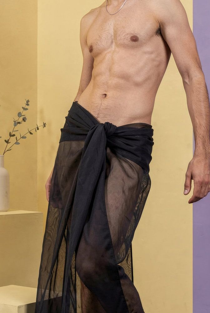 Fashion shoot captures the model showcasing delicate, draped sheer material.