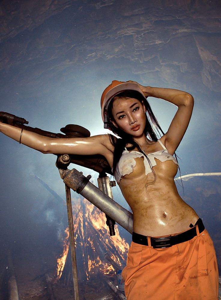 This Asian girl from China is standing almost topless in a mine in front of a campfire. Because of the work and the warmth the body of the Chinese is dirty and sweaty.