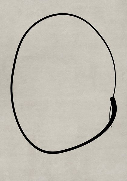 A return to the origins of artistic expression through Line Art Minimalism. On a warm grey canvas with subtle textures, a single, continuous, and vital black line forms an irregular circle. The line thickens slightly at the lower right, evoking the deliberate strength of a brushstroke, representing a recurring thought or a cycle of…