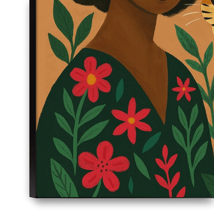 Buy this flower art Modern African Portrait: Woman with Flowers and Tiger by Patricia Leona Art on canvas, ArtFrame, poster and wallpaper, printed on demand in high quality.