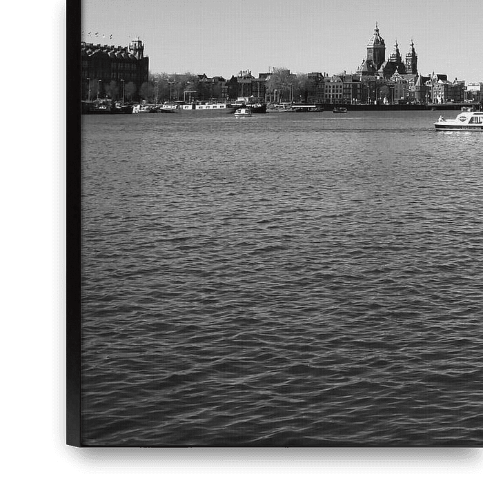 A dynamic black-and-white cityscape of Amsterdam, featuring the striking Jan Schaefer Bridge spanning the waters of the Oosterdok. The modern architecture on the horizon provides a striking contrast to the hustle and bustle on the water and the distant, historic skyline. A contemporary artwork that captures the energy and architectural…