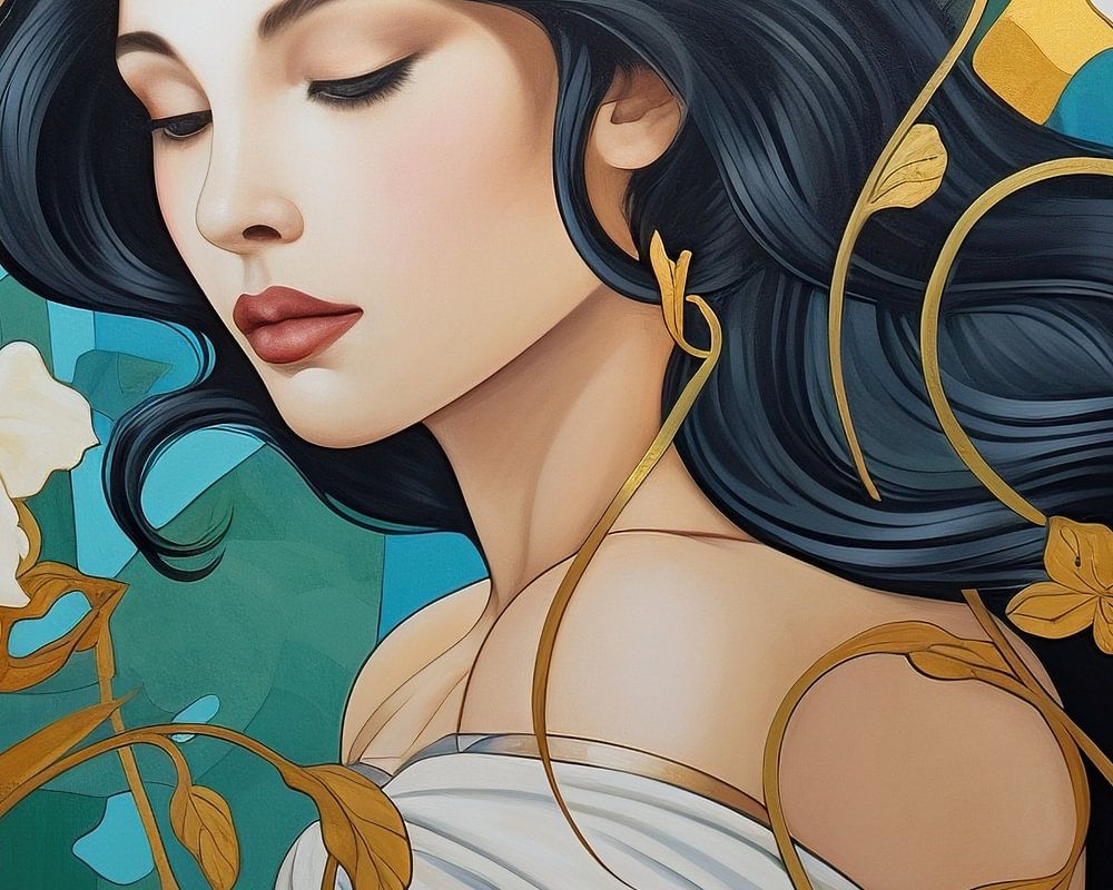 Modern Art Nouveau - The artwork shows a stylistic portrait of a woman surrounded by blooming flowers, probably dogwood blossoms, with gold and turquoise accents adding a touch of elegance and serenity. The style appears to be a modern fusion of Art Nouveau influences with flowing lines and a harmonious colour palette. The delicate blending of nature and feminine forms creates an intriguing visual story.