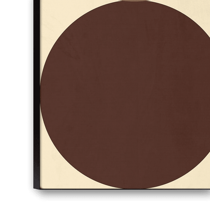 This minimalist artwork is divided into four quadrants, featuring a balanced arrangement of circles and semicircles. The warm, monochromatic palette uses shades of brown—from deep chocolate to medium caramel—set against a light cream background. The design creates a pleasing, geometric rhythm with overlapping and mirroring shapes.