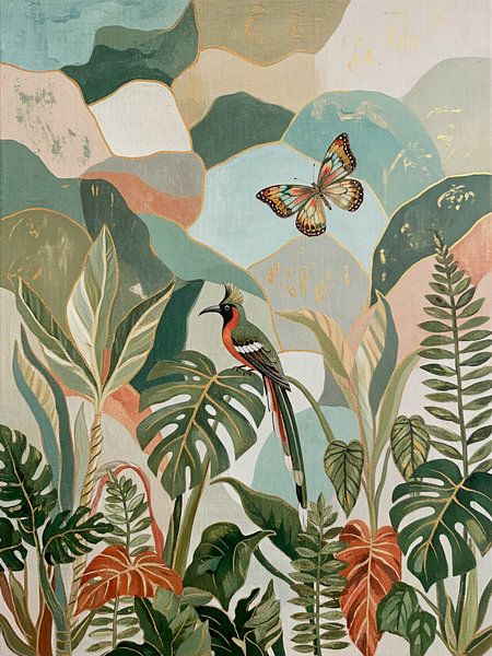 Buy this bird art Modern Biophilic Design with Exotic Butterfly, Monstera and Ferns by Studio Pieternel on canvas, ArtFrame, poster and wallpaper, printed on demand in high quality.