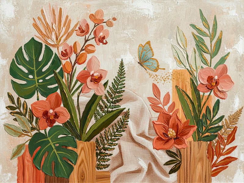 Buy this butterfly art Modern Biophilic Design with Orchids and Monstera by Studio Pieternel on canvas, ArtFrame, poster and wallpaper, printed on demand in high quality.