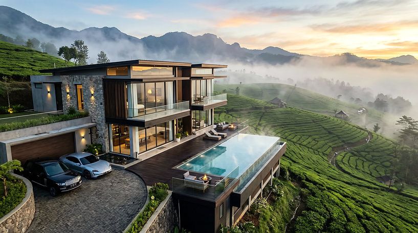 Buy this landscape artwork Modern Hillside Mansion in Nature by rendy okta on canvas, ArtFrame, poster and wallpaper, printed on demand in high quality.