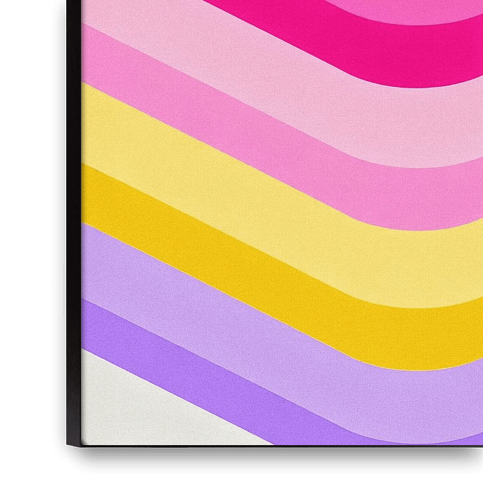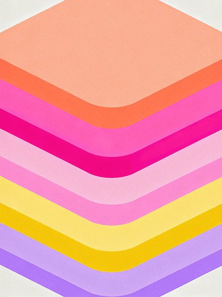 Elevate your interior space with this vibrant, retro-inspired geometric art print. Featuring a series of smooth, rounded chevron layers, this piece showcases a stunning color gradient—from warm peach and energetic magenta to sunny mustard yellow and soft lavender.