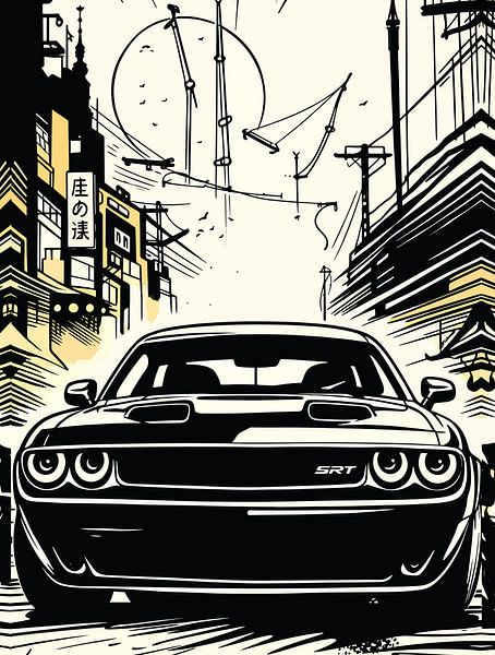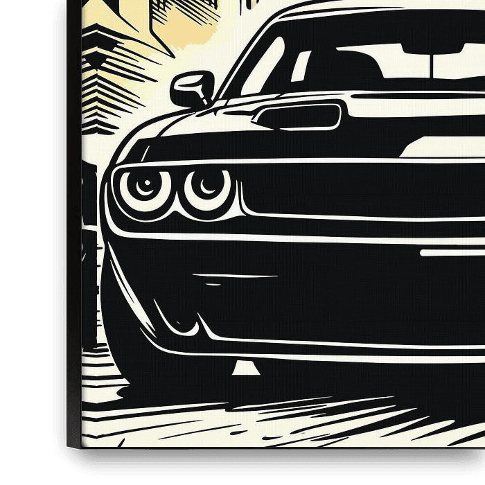 Energetic pop-art illustration of the aggressive front of a modern muscle car — wide stance, large circular headlights, deep hood scoop and strong retro energy. High-contrast and powerful — heroic automotive art for modern walls that love muscle power and street style.