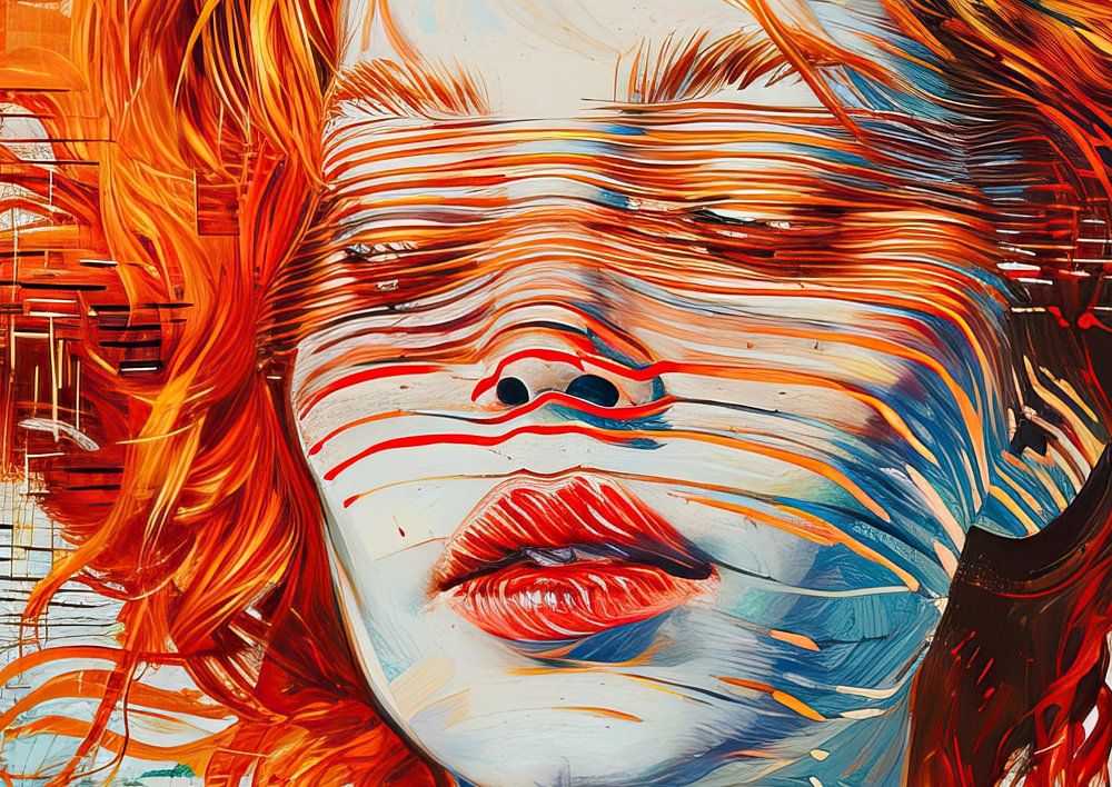 Modern Portrait | Orange Flames - In this vibrant portrait, the harmonious chaos of orange and blue hues is immediately striking, with the dynamic linework giving a special depth to the image of the woman with closed eyes. The red hair almost looks like flames against the cooler background, creating a pronounced contrast and a modern, somewhat abstract, and energetic look.