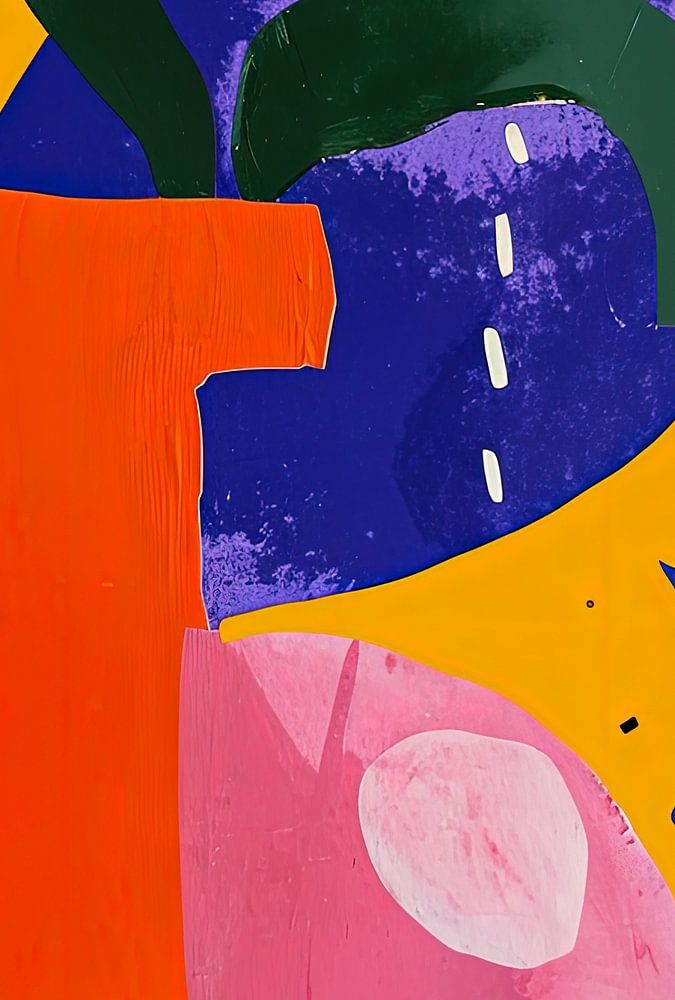 This trendy expressive artwork is a dynamic composition of abstract shapes and vibrant colours.