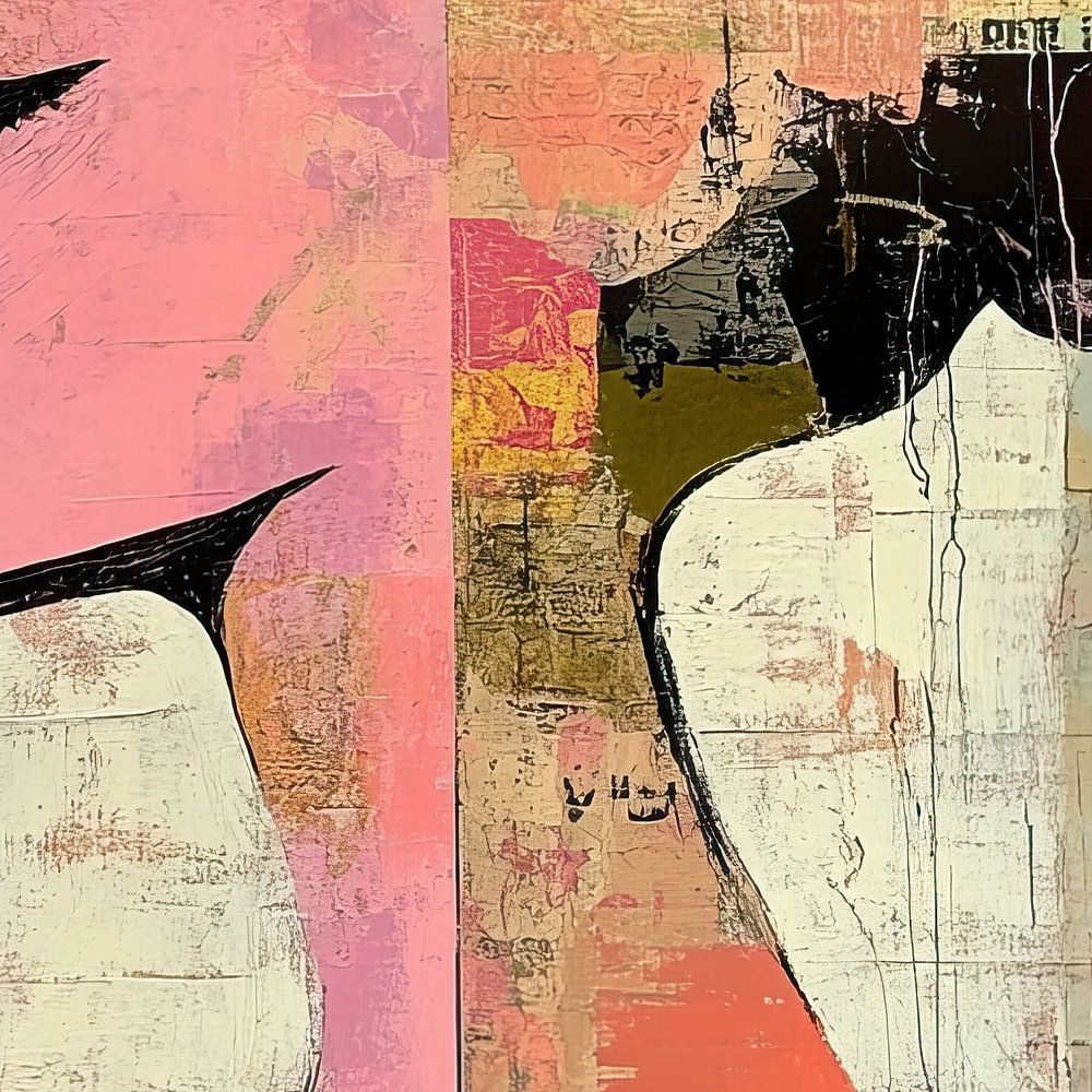 Modern Woman with Pink and Black - This abstract portrait painting shows a woman in profile, with soft pink skin tones and a striking black hair bundle, surrounded by various colour areas and textures that give a modern look.
