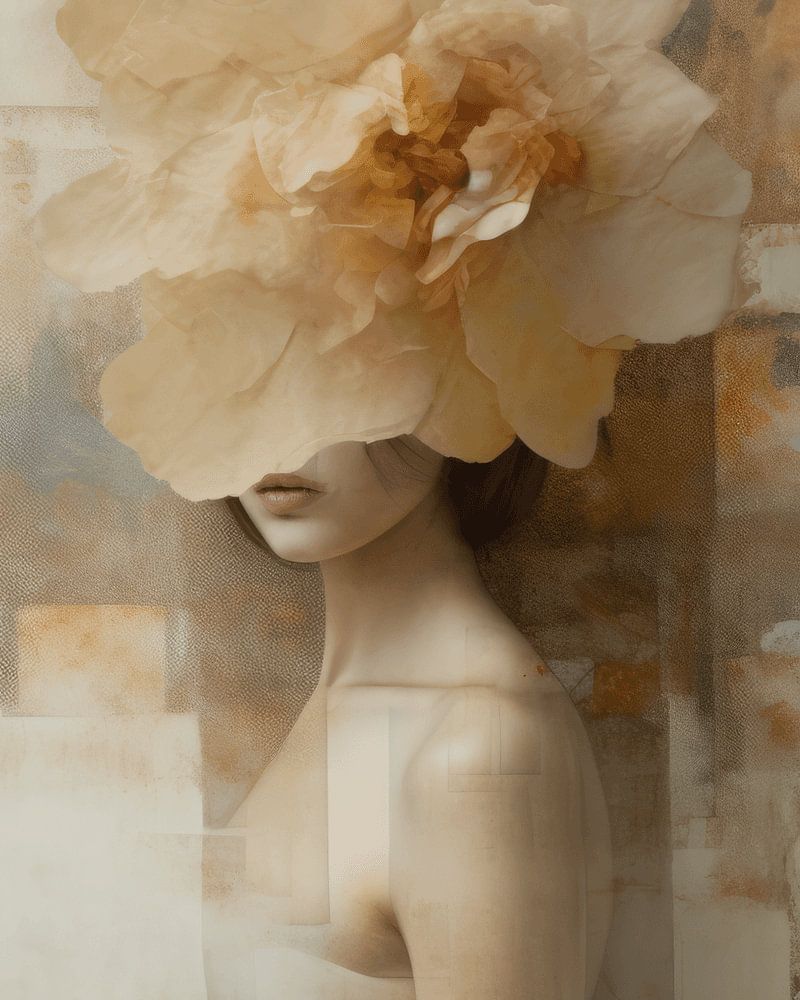 Modern and abstract "Flower girl". An unusual portrait in soft colours with a romantic and poetic feel. Despite being faded, the contours of a young woman with flowers are still clearly recognisable. Earth tones.