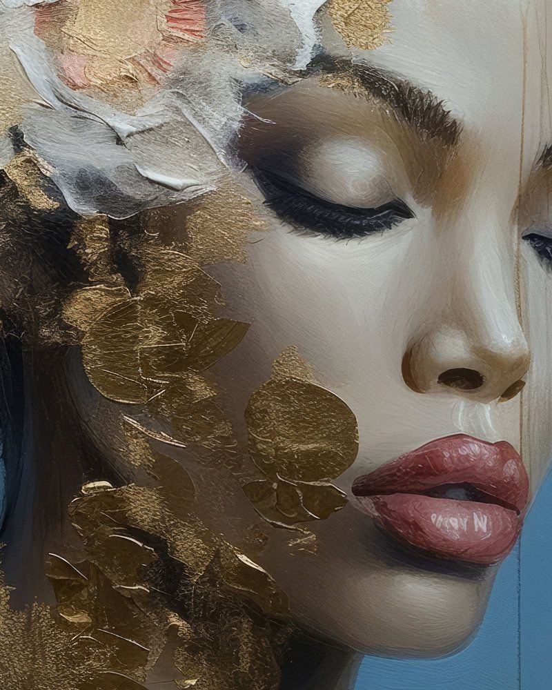 Modern and abstract portrait in white, blue and gold of a young woman with white flower in her hair. A real eye-catcher for your interior!