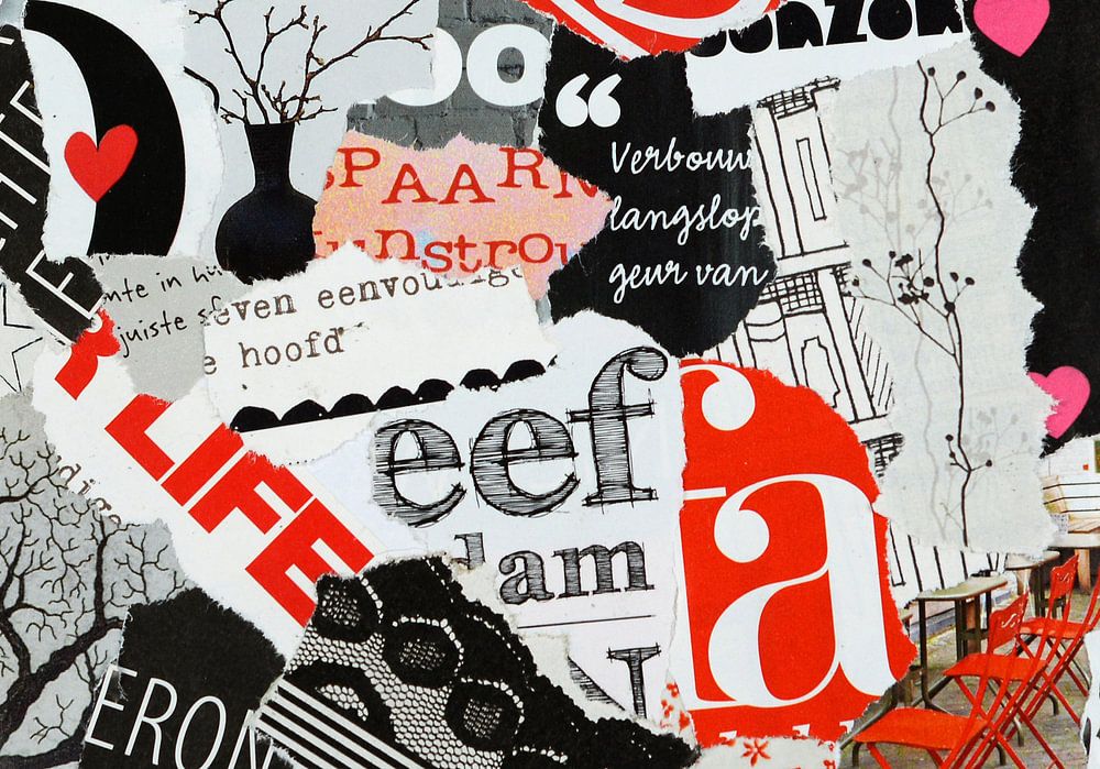 Buy this modern artwork Modern collage of waste paper in red and white black by Trinet Uzun on canvas, ArtFrame, poster and wallpaper, printed on demand in high quality.