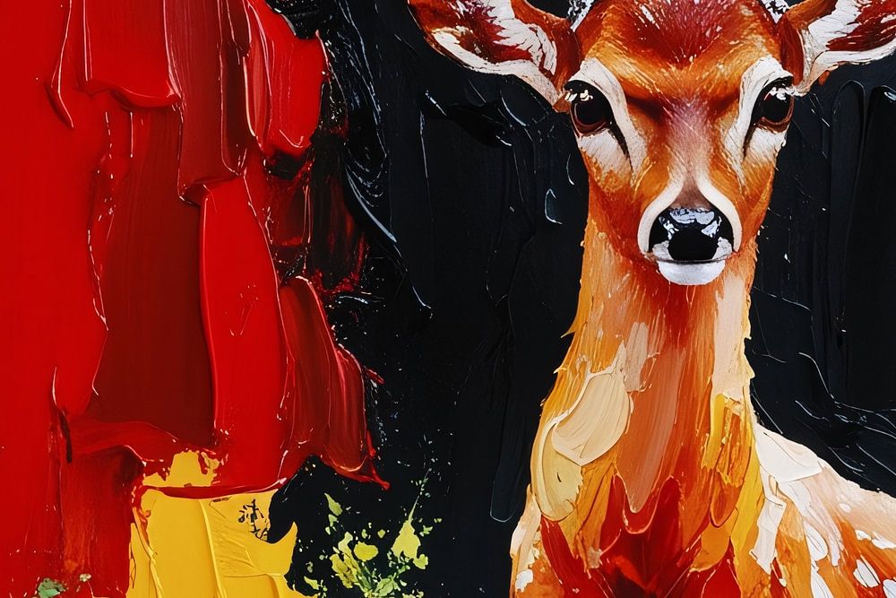 This painting combines an expressive style with the vibrant energy of a deer in a dynamic landscape. The deer, realistic but with modern flair, stands out against an abstract background in shades of red and black. This artwork not only brings colour and life to your interior, but also invites interpretation. Ideal for lovers of animals and modern art, perfect for bringing a living room or office to life.