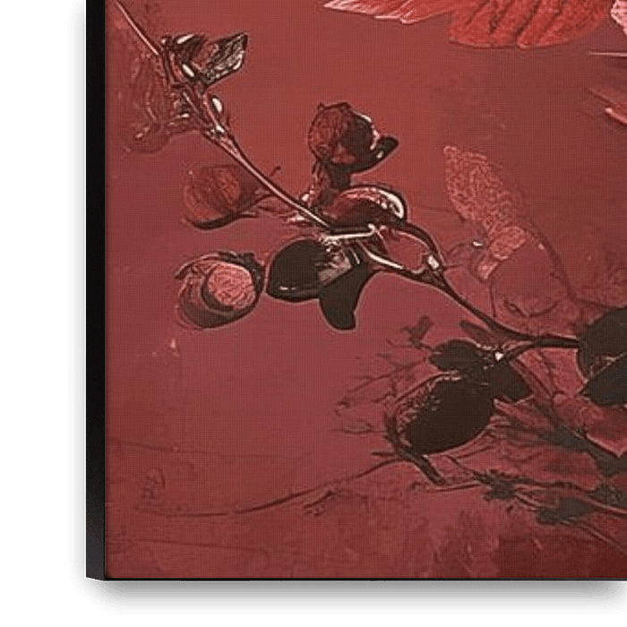 Modern Flower Arrangement | Robust Floral Splendour - This artwork is a stylish fusion of floral elements, interwoven with a robust burgundy background that creates a deep, rich look. The composition is a modern interpretation of a classic floral still life, with a mix of flowers such as hydrangea's and possibly magnolia's, giving a…